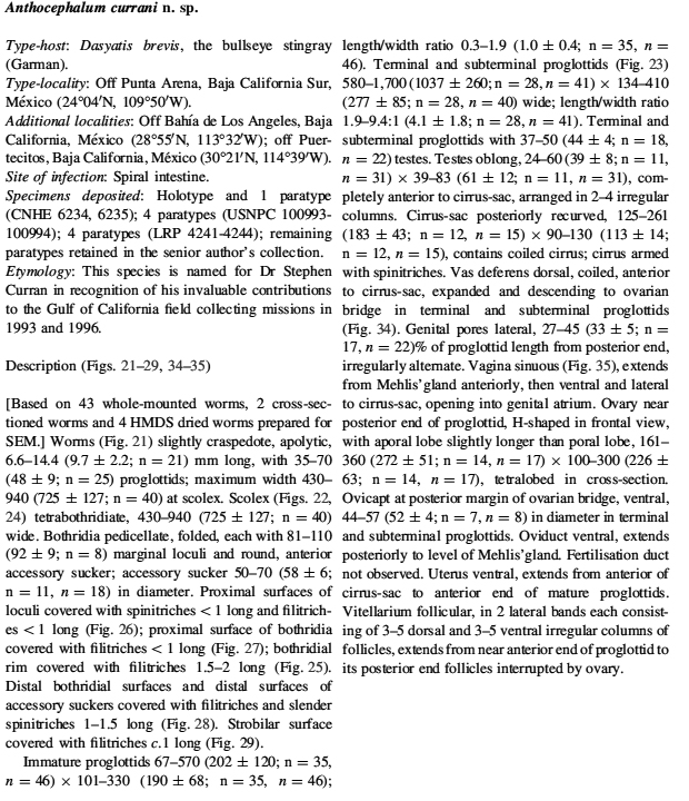 Ruhnke, T. R. and H. B. Seaman. 2009. Three new species of Anthocephalum Linton, 1890 (Cestoda: Tetraphyllidea) from dasyatid stingrays of the Gulf of California. Systematic Parasitology 72: 81-95. (4449) Download PDF |