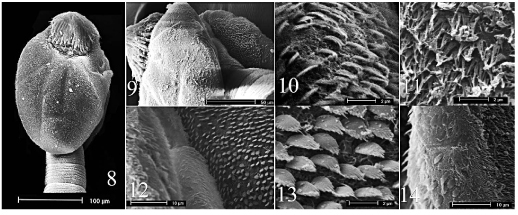 FIGURES 8–14. Scanning electron micrographs of Macrobothridium sinensis n. sp. (8) Scolex. (9) Lateral view of scolex. (10) Palmate microtriches on cephalic peduncle. (11) Three digits pectinate on distal bothrial surfaces. (12) Lateral view between 2 bothria. (13) Six–seven digits palmate microtriches on proximal bothrial surfaces. (14) Border between distal and proximal bothrial surfaces marked abrupt change in microtrich type from 3 digits pectinate to 6–7 digits palmate microtriches.