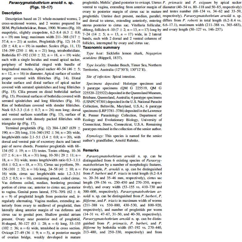 Ruhnke, T. R. and V. A. Thompson. 2006. Two new species of Paraorygmatobothrium (Tetraphyllidea: Phyllobothriidae) from the lemon sharks Negaprion brevirostris and Negaprion acutidens (Carcharhiniformes: Carcharhinidae). Comparative Parasitology 73(1): 35-41. (4452) Download PDF |