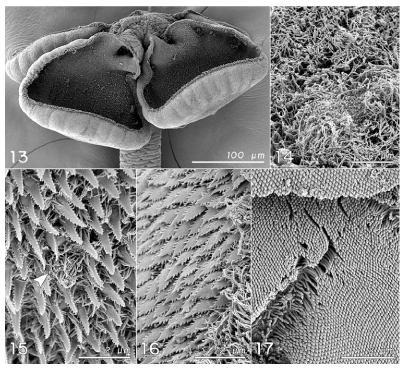 Figures 13–17. Scanning electron micrographs of Paraorygmatobothrium arnoldi n. sp. 13. Scolex. 14. Apical surface of scolex proper. 15. Distal surface of bothridium (note cilium at arrow). 16. Proximal surface of bothridium, near rim of bothridium. 17. Surface of anterior region of strobila.