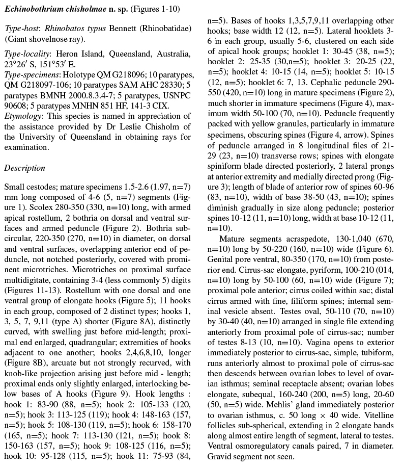 Jones, M. J. and I. Beveridge. 2001. Echinobothrium chisholmae n. sp. (Cestoda, Diphyllidea) from the giant shovel-nose ray Rhinobatos typus from Australia, with observations on the ultrastructure of its scolex musculature and peduncular spines. Systematic Parasitology 50: 41-52. (4459) Download PDF |