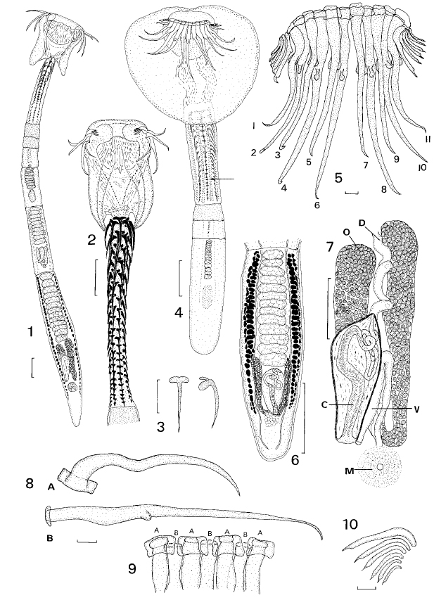 Figures 1–10. Echinobothrium chisholmae n. sp. 1. Mature worm, lateral view. 2. Scolex and peduncle, lateral view. 3. Spines of cephalic \\r\\npeduncle. 4. Immature worm, dorso-ventral view. 5. Rostellar hooks. 6. Mature segment, dorso-ventral view. 7. Reproductive anatomy, \\r\\ndorso-ventral view. 8. Two types of hooks (A and B) present on scolex. 9. Origins of hooks showing enlarged bases of hooks A and smaller bases of hooks B interlocking posterior to bases of hooks A. 10. Hooklets. Abbreviations: C, cirrus-sac; D, vas deferens; M, Mehlis’ gland; V, vagina; O, ovary. Scale-bars: 1-2,4,6, 1 mm; 3,5,8-10, 0.01 mm; 7, 0.1 mm.