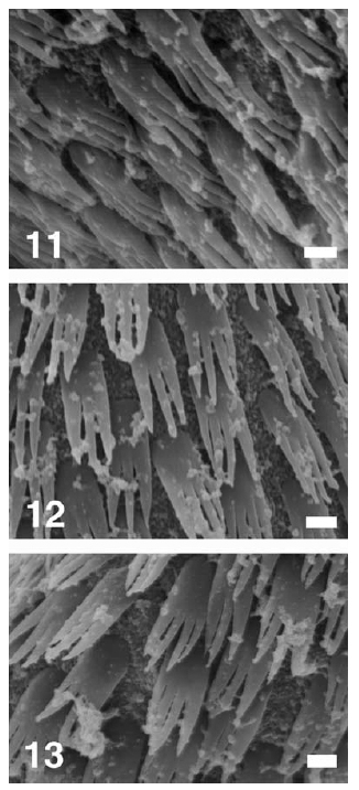 Figures 11–13. Echinobothrium chisholmae n. sp., microtriches of proximal surface of bothria, scanning electron microscopy. 11. Posterior region of bothrium. 12. Anterior region of bothrium. 13. Posterior region of bothrium. Note that microtriches have 3-5 digits. Scale-bars: 1 µm.