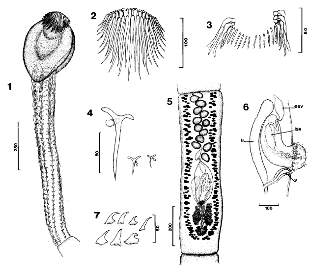 Figs. 1-7. Echinobothrium megacanthum n. sp. Fig.1. Scolex. Fig. 2. Large apical hoks. Fig. 3. Detail of hooklets from lateral view of scolex. Fig.4. Spines on the cephalic peduncle. Fig. 5. Mature segment, ventral view. Fig. 6. Detail of terminal genitalia (holotype), lateral view, note partially everted cirrus. Fig. 7. Detail of cirrus spines. Abbreviations: esv= external seminal vesicle, isv= internal seminal vesicle, u= uterus, v= vagina.