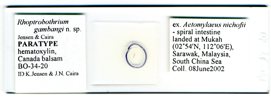 Jensen, K. and J. N. Caira. 2006. The status of Rhoptrobothrium Shipley et Hornell, 1906 (Cestoda: Tetraphyllidea), with redescription of the type species, R. myliobatidis, and description of three new species from two species of Aetomylaeus (Myliobatiformes: Myliobatidae) from Malaysian Borneo. Folia Parasitologica 53: 189-207. (4505) Download PDF |
