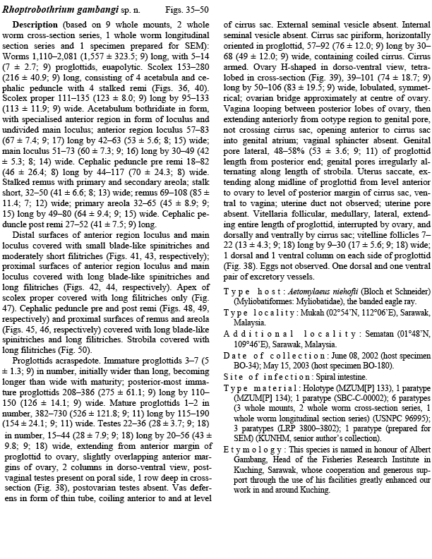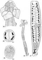 Figs. 3539. Line drawings of Rhoptrobothrium gambangi sp. n. Fig. 35. Whole worm (paratype, USNPC 96995). Fig. 36.