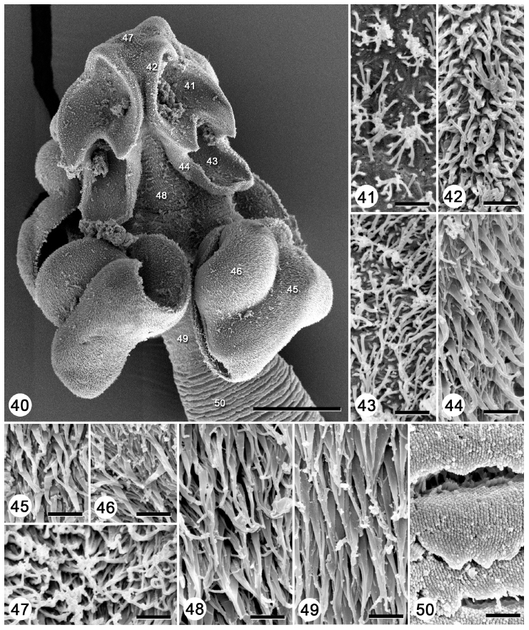 to remi. Fig. 50. Microtriches on immature proglottid. Scale bars: Fig. 40 = 50 μm; Figs. 4150 = 1 μm.