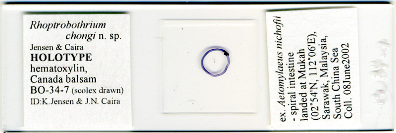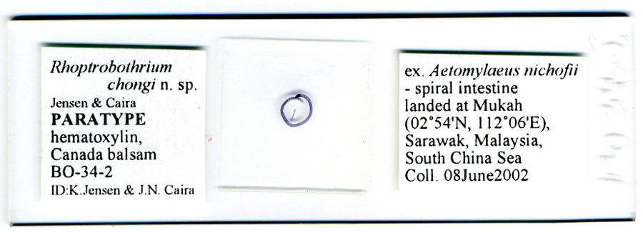 | Type Material | Holotype (MZUM (P) 131) and 1 paratype (MZUM (P) 132); 1 paratype (SBC-C-00001); 4 paratypes (3 whole mounts, 1 scolex longitudinal section series) (USNPC No. 96994); 2 paratypes (LRP Nos. 3797, 3798); 2 paratypes (prepared for SEM) (KUNHM, authors collection) |