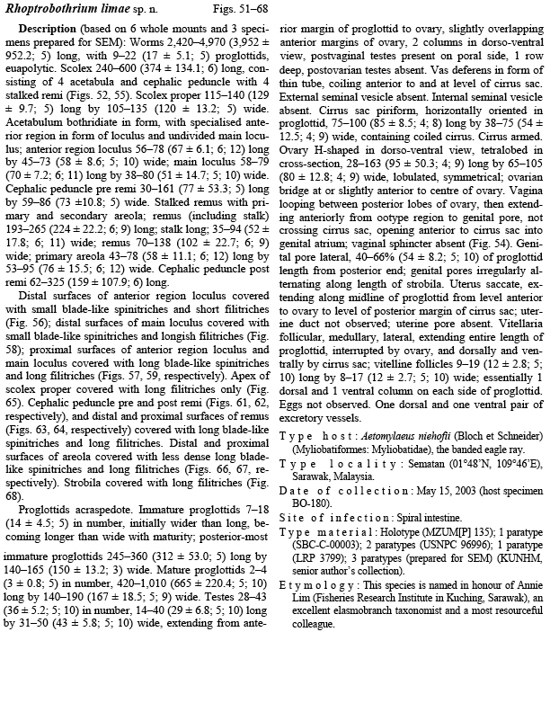 | Valid Name | Myzophyllobothrium limae (Jensen & Caira, 2006) Jensen, Pen & Caira, 2021 |