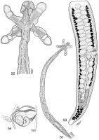 Figs. 5154. Line drawings of Rhoptrobothrium limae sp. n. Fig. 51. Whole worm (paratype, USNPC 96996). Fig. 52. Scolex