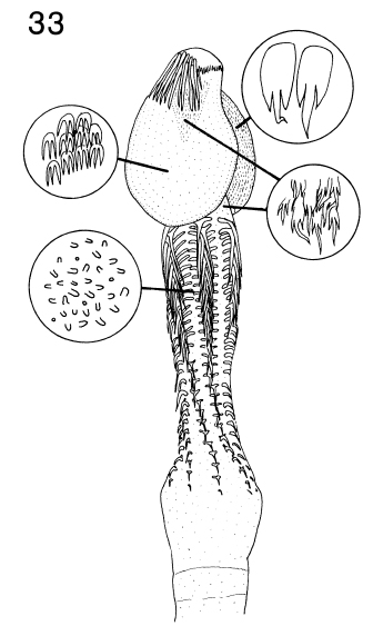 FIGURE 33. Summary of distribution of various microtrich forms on scolex of Echinobothrium fautleyae n. sp.