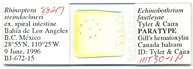 Tyler, G. A. and J. N. Caira. 1999. Two new species of Echinobothrium (Cestoidea: Diphyllidea) from myliobatiform elasmobranchs in the gulf of California, Mexico. Journal of Parasitology 85: 327-335. (3838) Download PDF |