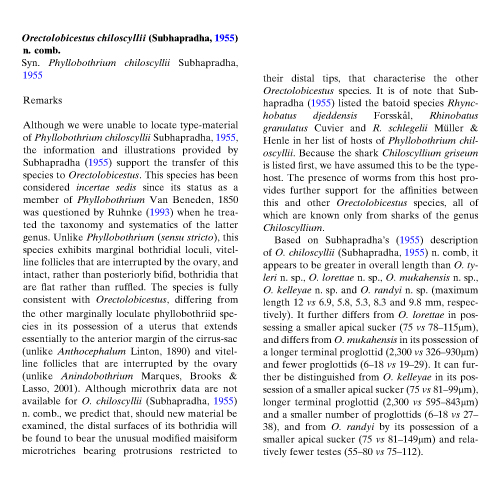 Subhapradha, C. K. 1955. Cestode parasites of fishes of Madras Coast. Indian Journal of Helminthology 7(2): 41-132. (462) Download PDFRuhnke, T. R., J. N. Caira, and S. D. Carpenter. 2006. Orectolobicestus n. g. (Cestoda: Tetraphyllidea), with the description of five new species and the transfer of Phyllobothrium chiloscyllii to the new genus. Systematic Parasitology 65: 215-233. (4453) Download PDF |