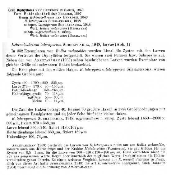 Fig. Echinobothrium lateroporum Subhapradha, 1948, subspec. nigracantha nov. subespec., larvae from Bullia melanoides (Deshayes).