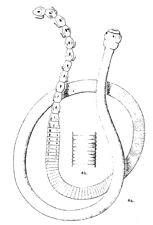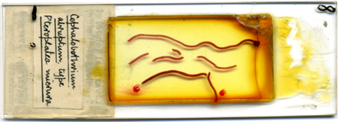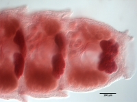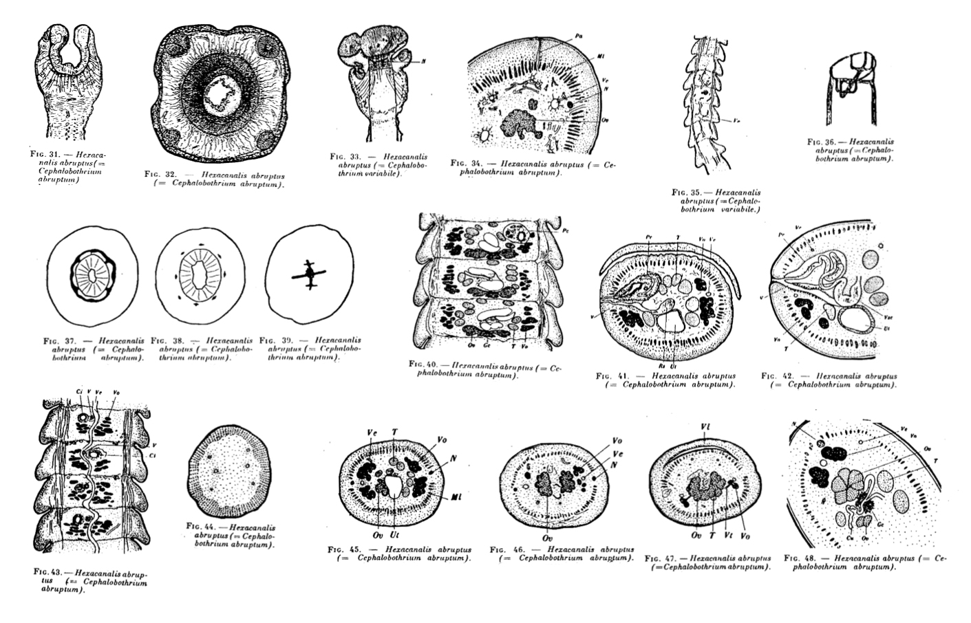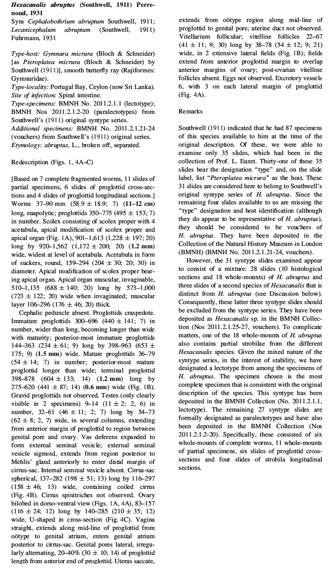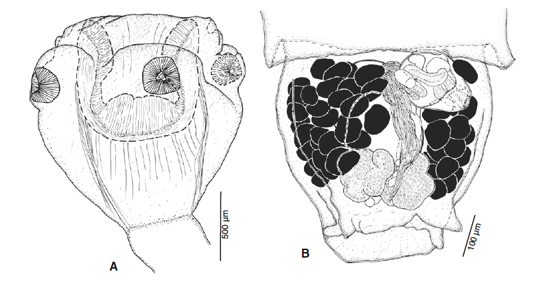 From Cielocha and Jensen, 2011 (Cit# 5085) Fig. 1. Line drawing of Hexacanalis abruptus (Southwell, 1911) Perrenoud, 1931. A. Scolex (BMNH No. 2011.2.1.11, paralectotype); B. Mature proglottid, dorso-... MoreFrom Cielocha and Jensen, 2011 (Cit# 5085) Fig. 1. Line drawing of Hexacanalis abruptus (Southwell, 1911) Perrenoud, 1931. A. Scolex (BMNH No. 2011.2.1.11, paralectotype); B. Mature proglottid, dorso-ventral view (BMNH No. 2011.2.1.1, lectotype) |