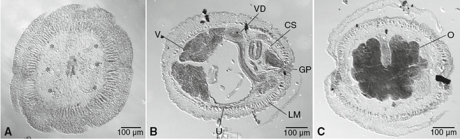 From Cielocha and Jensen, 2011 (Cit# 5085) Fig. 4. Light micrographs of Hexacanalis spp. A-C. H. abruptus (Southwell, 1911) Perrenoud, 1931: A. Cross-section through mature proglottid at anterior prog... MoreFrom Cielocha and Jensen, 2011 (Cit# 5085) Fig. 4. Light micrographs of Hexacanalis spp. A-C. H. abruptus (Southwell, 1911) Perrenoud, 1931: A. Cross-section through mature proglottid at anterior proglottid margin (BMNH No. 2011.2.1.16, paralectotype); asterisks indicate position of excretory vessels; B. Cross-section through mature proglottid at level of genital pore (BMNH No. 2011.2.1.16, paralectotype); C. Cross-section through mature proglottid at level of ovarian bridge (BMNH No. 2011.2.1.16, paralectotype). Abbreviations: CS, cirrus-sac; GP, genital pore; LM, longitudinal muscle; O, ovary; T, testis; U, uterus; V, vitelline follicles; VA, vagina; VD, vas deferens |
