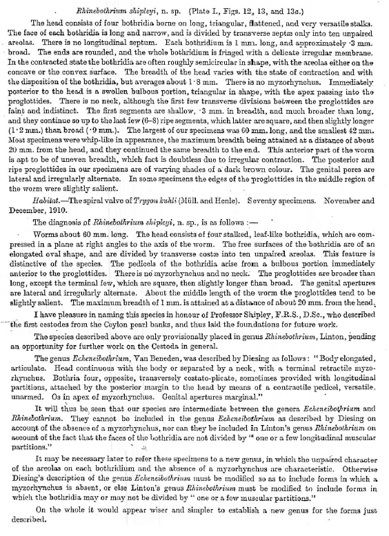 Southwell, T. 1912. A description of ten new species of cestode parasites from marine fishes of Ceylon, with notes on other cestodes from the same region. Ceylon Marine Biological Report 1: 259-278. (438) Download PDFBall, D., L. Neifar, and L. Euzet. 2003. Proposition de Scalithrium n. gen. (Cestoda, Tetraphyllidea) avec comme espèce-type Scalithrium minimum (Van Beneden, 1850) n. comb. parasite de Dasyatis pastinaca (Elasmobranchii, Dasyatidae). Parasite 10: 31-37. (4500) Download PDF |