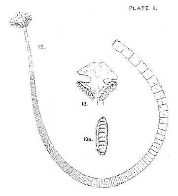 Plate 1. Fig. 12. Rhinebothrium shipleyi n. sp. Entire cestode. x4 1/2. Fig. 13. Head of same. x10. Fig. 13a. One bothridium of same. x16.