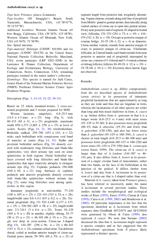 Ruhnke, T. R. and J. N. Caira. 2009. Two new species of Anthobothrium van Beneden, 1850 (Tetraphyllidea: Phyllobothriidae) from carcharhinid sharks, with a redescription of Anthobothrium laciniatum Linton, 1890. Systematic Parasitology 72: 217-227. (4503) Download PDF |