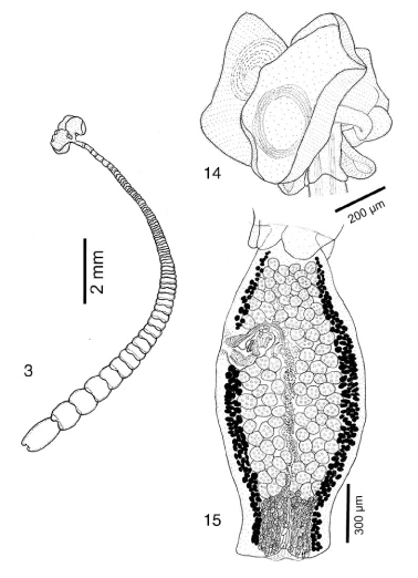 Fig. 3. A. caseyi n. sp., whole worm (holotype USNPC 101169); Figs. 14–15. A. caseyi n. sp. 14. Scolex (paratype USNPC 101170). 15. Terminal proglottid (paratype USNPC 101170)