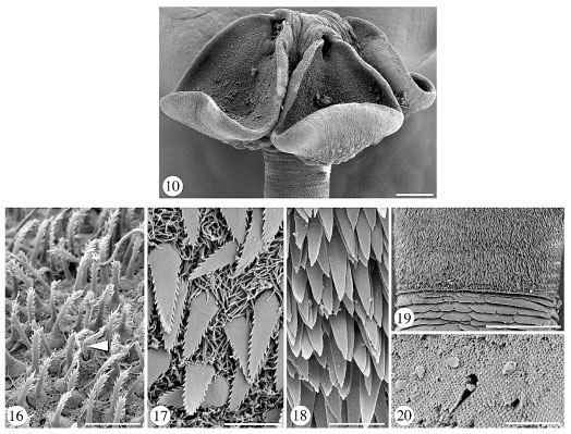 FIGURES 10, 16–20. Scanning electron micrographs of Paraorygmatobothrium kirstenae n. sp. 10. Scolex. 16. Distal bothridial surface, note presence of a cilium (arrowhead). 17. Proximal bothridial surface. 18. Cephalic peduncle surface. 19. Cephalic peduncle. 20. Surface of strobilar scutes. Scales bars: 10, 50 µm; 16–18, 20, 2 µm; 20, 5 µm.