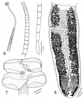 FIGURES 6–8. Paraorygmatobothrium kirstenae n. sp. 6. Whole worm. 7. Scolex. 8. Terminal proglottid.