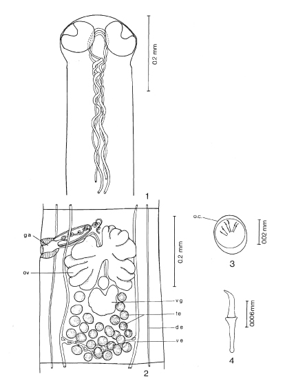 Figs. 1-4. Oochoristica javaensis n. sp. Fig. 1. Scolex. Fig. 2. Mature proglottid, ventral view. Fig. 3. Egg. Fig. 4. Oncosphere hook. de, dorsal excretory duct; ga, genital atrium; oc, oncosphere capsule; ov, ovary; te, testes; ve, ventral excretory duct; vg, vitelline gland.