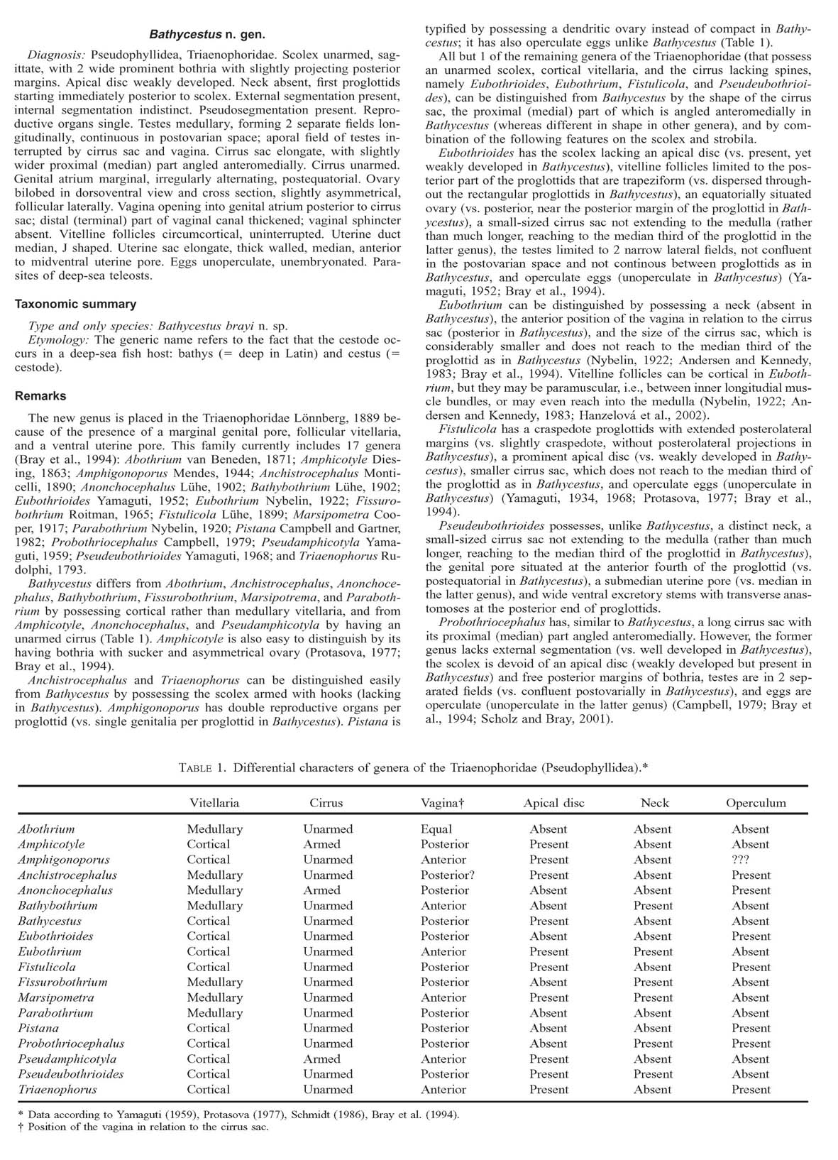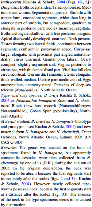 | Type Species | Bathycestus brayi Kuchta & Scholz, 2004 |