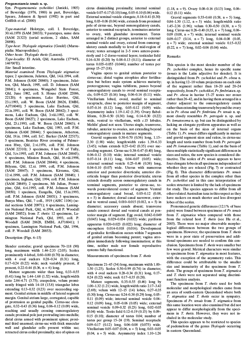 Figs. 6-15. Figs. 6–12 Progamotaenia tenuis n. sp. from Thylogale stigmatica (Gould). 6. Entire worm. 7. Scolex of relaxed specimen with neck region evident. 8. Scolex of contracted specimen without neck region. 9. Genitalia in segment immediately prior to patency of genital atrium, with vagina opening posterior to cirrus-sac; the seminal receptacle is empty. 10. Genitalia seven segments posterior to those