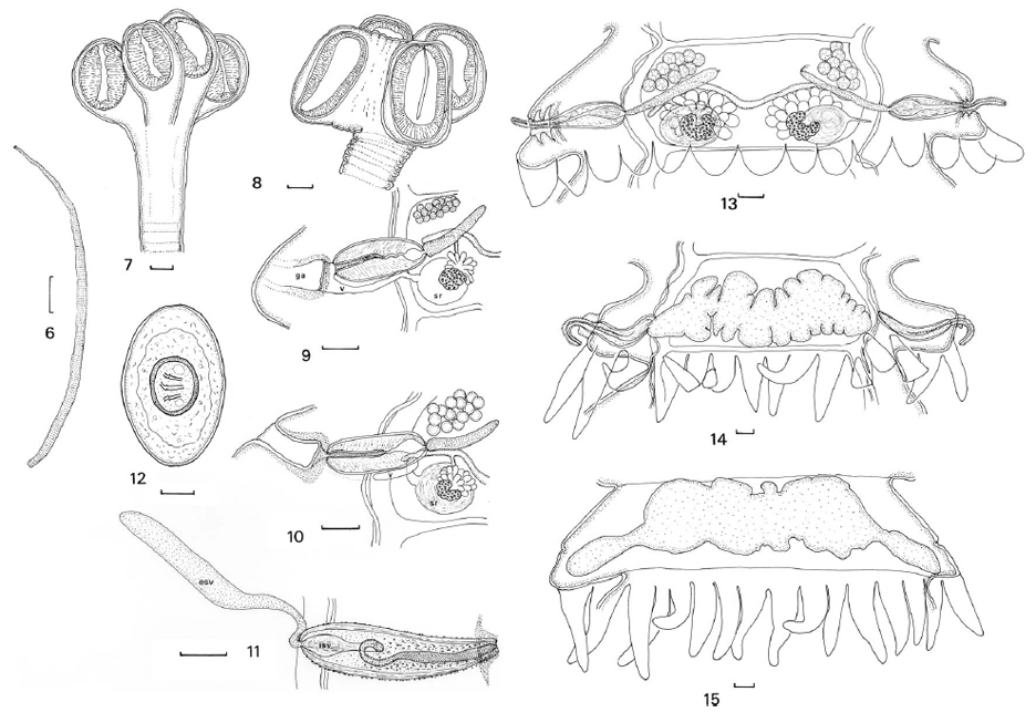illustrated in Fig. 9. The genital atrium is patent, the seminal receptacle is full of sperm and the distal vagina has atrophied. 11. Cirrus-sac and external seminal vesicle in mature segment. 12 Egg. Scale-bars: 6, 1 cm; 7–11, 0.1 mm; 12, 0.01 mm. Abbreviations: esv, external seminal vesicle; ga, genital atrium; isv, internal seminal vesicle; sr, seminal receptacle; v, vaginaFigs. Figs. 13–15 Progamotaenia tenuis n. sp. from Thylogale stigmatica (Gould). 13. Mature segment. 14. Pre-gravid segment. 15. Gravid segment. Scale-bars: 0.1 mm