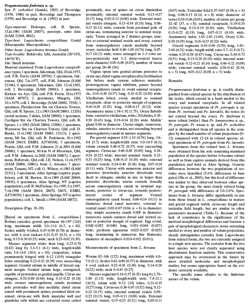 Beveridge, I. 2007. Revision of the Progamotaenia zschokkei (Janicki, 1905) complex (Cestoda: Anoplocephalidae), with the description of six new species. Systematic Parasitology 66: 159-194. (4534) Download PDF |