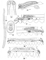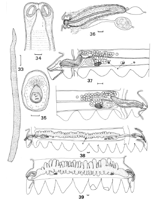 Figs. 33–39 Progamotaenia fimbriata n. sp. from Lagorchestes conspicillatus Gould. 33. Entire worm. 34. Scolex. 35. Egg. 36. Cirrus-sac, vagina and seminal receptacle of mature segment. 37. Mature segment. 38. Pre-gravid segment. 39. Gravid segment. Scale-bars: 33, 1 cm; 34,36–39, 0.1 mm; 35, 0.01 mm. Abbreviations: a, vestigial accessory genitalia