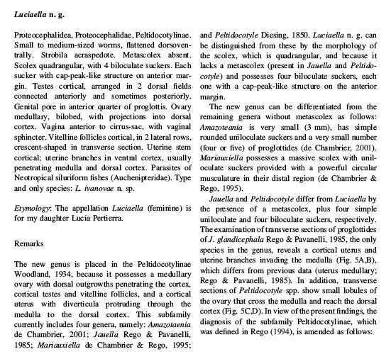 Gil de Pertierra, A. A. 2009. Luciaella ivanovae n. g., n. sp. (Eucestoda: Proteocephalidea: Peltidocotylinae), a parasite of Ageneiosus inermis (L.) (Siluriformes: Auchenipteridae) in Argentina. Systematic Parasitology 73: 71-80.