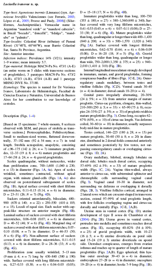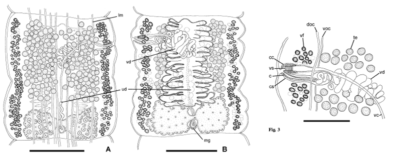 Fig. 2 Luciaella ivanovae n. g., n. sp. from Ageneiosus inermis. A, mature proglottis in dorsal view; osmoregulatory canals not drawn; B, gravid proglottis in ventral view; osmoregulatory canals and i... MoreFig. 2 Luciaella ivanovae n. g., n. sp. from Ageneiosus inermis. A, mature proglottis in dorsal view; osmoregulatory canals not drawn; B, gravid proglottis in ventral view; osmoregulatory canals and internal longitudinal musculature not drawn. Abbreviations: lm, longitudinal musculature; mg, Mehlis’ gland; ud, uteroduct; vd, vas deferens. Scale-bars: 500 µm. Fig. 3 Luciaella ivanovae n. g., n. sp. from Ageneiosus inermis; detail of the terminal genitalia in dorsal view. Abbreviations: c, cirrus; cc, chromophilic cells; cs, cirrus-sac; doc, dorsal osmoregulatory canal; te, testis; vc, vaginal canal; vd, vas deferens; vf, vitelline follicles; voc, ventral osmoregulatory canal; vs, vaginal sphincter. Scale-bars: 250 µm |