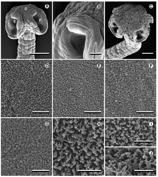 Fig. 4 Luciaella ivanovae n. g., n. sp. n. from Ageneiosus inermes, SEM micrographs. A, dorsoventral view of scolex indicating location of magnified surfaces shown in D–J; B, detail of the anterior lo... MoreFig. 4 Luciaella ivanovae n. g., n. sp. n. from Ageneiosus inermes, SEM micrographs. A, dorsoventral view of scolex indicating location of magnified surfaces shown in D–J; B, detail of the anterior loculus of the sucker showing the cap-peak-like structure; C, wrinkled apical surface of scolex; D, apical surface of scolex; E, luminal surface of sucker; F, marginal surface of sucker; G, non-adherent surface of sucker; H, surface of proliferation zone; I, surface of immature proglottis; J, surface of mature proglottis. Scale-bars: A, 500 µm; B, 100 µm; C, 200 µm; D–J, 2 µm |