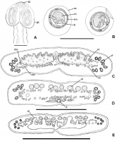 Fig. 1 Luciaella ivanovae n. g., n. sp. from Ageneiosus inermis. A, scolex in dorsoventral view showing gland cells; B, spontaneously laid eggs; C, transverse section of mature proglottis at level of ... MoreFig. 1 Luciaella ivanovae n. g., n. sp. from Ageneiosus inermis. A, scolex in dorsoventral view showing gland cells; B, spontaneously laid eggs; C, transverse section of mature proglottis at level of ovary; D,E, transverse sections of last immature proglottis and gravid proglottides at level of testes, showing the development of the uterus. Abbreviations: doc, dorsal osmoregulatory canal; em, embryophore; gc, gland cells; lh, larval hooks; lm, longitudinal musculature; oe, outer envelope; on, oncosphere; ov, ovary; te, testis; ut, uterus; vf, vitelline follicles; voc, ventral osmoregulatory canal. Scale-bars: A,C–E, 500 µm; B, 50 µm |