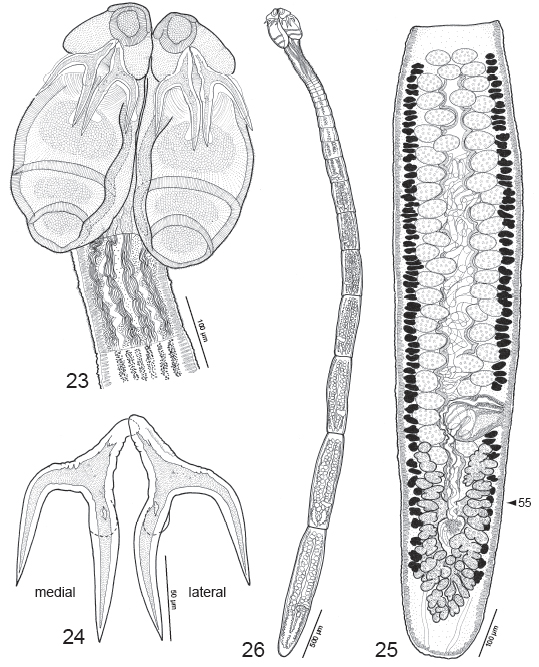 Figs. 23-26. Line drawing of Acanthobothrium romanowi sp. n. Fig. 23. Scolex (USNPC 101965). Fig. 24. Hooks (QM G231360). Fig. 25. Terminal proglottid (QM G231360). Arrowhead indicates location of cross-section shown in Fig. 55. Fig. 26. Whole worm (QM G231360).