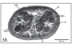 Histological sections. Fig. 55. Cross-section through ovary of Acanthobothrium romanowi sp. n. (LRP 4352). Abbreviations: DED - dorsal excretory duct; O - ovary; U - uterus; V - vitelline follicle; VED - ventral excretory duct; VG - vagina.