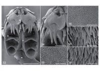 Figs. 33-38. Scanning electron micrographs of Acanthobothrium romanowi sp. n. Fig. 33. Scolex. Note: small numbers correspond to the figures showing higher magnification images of these surfaces. Fig. 34. Detail of apical pad and hooks. Fig. 35. Surface of apical pad. Fig. 36. Distal bothridial surface. Fig. 37. Proximal bothridial surface. Fig. 38. Cephalic peduncle surface. Scale bars: Fig. 33 = 100µm; Fig. 34 = 50µm; Figs. 35-38 = 2µm.