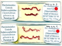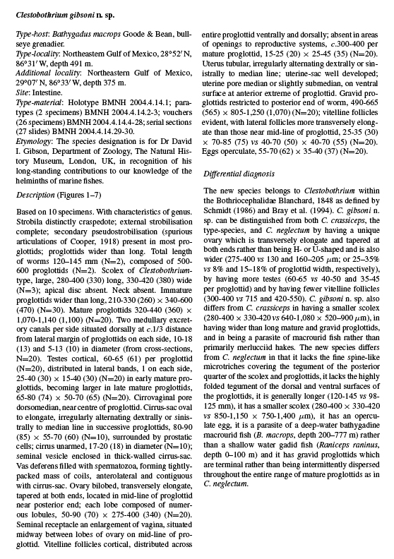 Dronen, N. O. and C. K. Blend. 2005. Clestobothrium gibsoni n. sp. (Cestoda: Bothriocephalidae) from the bullseye grenadier Bathygadus macrops Good & Bean (Macrouridae) in the Gulf of Mexico. Systematic Parasitology 60: 59-63. (4551) Download PDF |