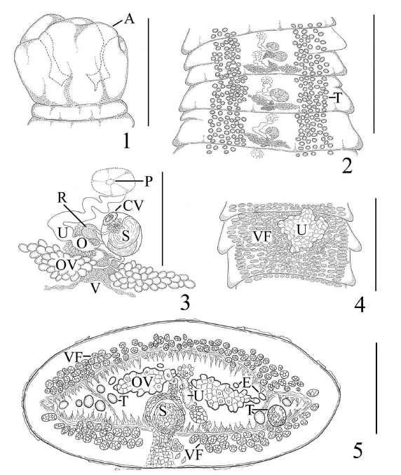 excretory canals; O, oötype; OV, ovary; P, uterine pore; R, seminal receptacle; S, seminal vesicle; T, testis; U, uterus; V, vitelline reservoir; VF, vitelline follicles. Scale-bars: 1, 265 μm; 2, 750 μm; 3, 190 μm; 4, 700 μm; 5, c.300 μm.