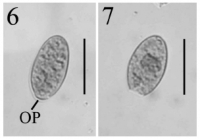 Figures 6–7. Clestobothrium gibsoni n. sp. from Bathygadus macrops. 6. Egg with operculum. 7. Egg with operculum removed. Abbreviation: OP, operculum. Scale-bars: 50 μm.