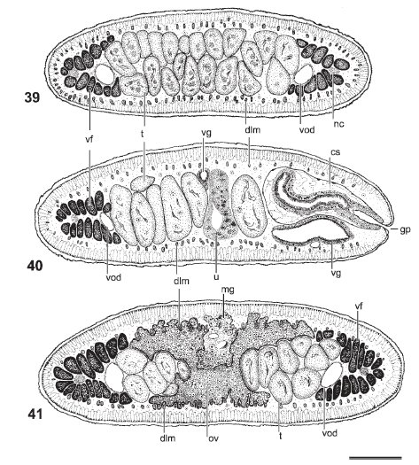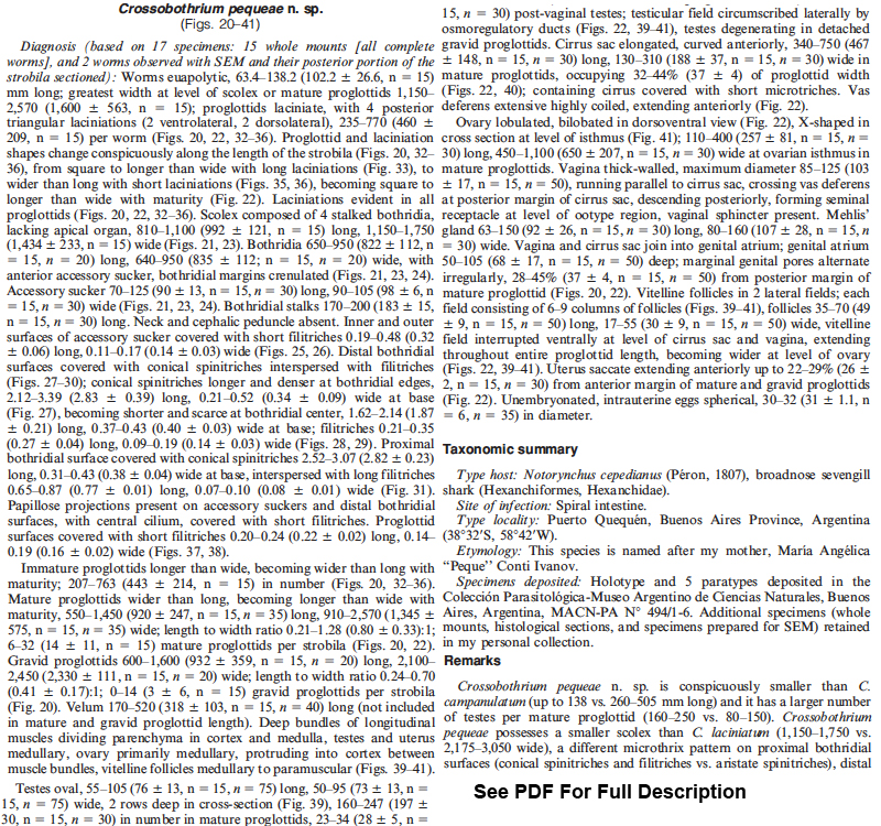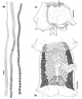 FIGURES 20–22. Crossobothrium pequeae n. sp. (20) Entire worm, scale bar = 1.6 mm. (21) Scolex, scale bar = 200 µm. (22) Mature proglottid, scale bar = 200 µm. |