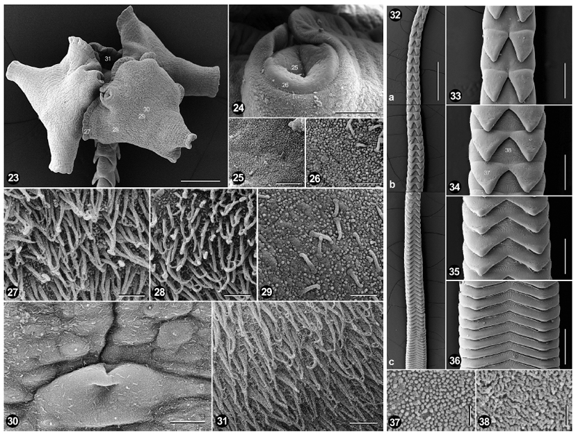 details shown in Figures 37 and 38. (37) Surface of laciniations in immature proglottid, scale bar = 1 µm. (38) Surface of anterior half of
