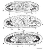 FIGURES 32–38. Crossobothrium pequeae n. sp., scanning electron micrographs. (32) Anterior region of strobila showing the variation in immature proglottid shape, from anterior to posterior (a–c), scal... MoreFIGURES 32–38. Crossobothrium pequeae n. sp., scanning electron micrographs. (32) Anterior region of strobila showing the variation in immature proglottid shape, from anterior to posterior (a–c), scale bar = 1 mm. (33–36) Detail of proglottid shape, from anterior (33) to posterior (36), scale bar = 200 µm. Small numbers in Figure 34 indicate locations of
