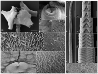 FIGURES 23–31. Crossobothrium pequeae n. sp., scanning electron micrographs. (23) Scolex, scale bar = 250 µm. Small numbers indicate locations of details shown in Figures 27–31. (24) Detail of accesso... MoreFIGURES 23–31. Crossobothrium pequeae n. sp., scanning electron micrographs. (23) Scolex, scale bar = 250 µm. Small numbers indicate locations of details shown in Figures 27–31. (24) Detail of accessory sucker, scale bar = 50 µm. Small numbers indicate locations of details shown in Figures 25 and 26. (25) Inner surface of accessory sucker, scale bar = 2 µm. (26) Outer surface of accessory sucker, scale bar = 2 µm. (27) Distal bothridial surface near the margin, scale bar = 2 µm. (28) Distal bothridial surface at midway between margin and center, scale bar = 2 µm. (29) Distal bothridial surface at the center of bothridium, scale bar = 2 µm. (30) Distal bothridial surface showing gradual change on microthrix size and density, sale bar = 10 µm. (31) Proximal bothridial surface, scale bar = 2 µm. |