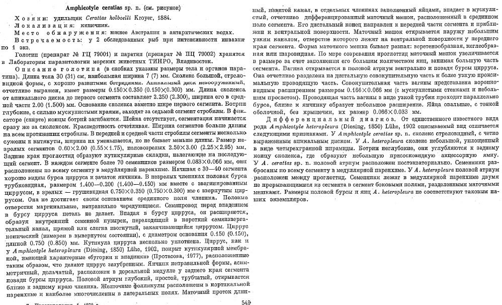Tkachev, V. 1979. Amphicotyle ceratias sp. n. (Pseudophyllideal; Amphicotylidae), a parasite of the marine fish, Ceratias holboelli. Parazitologiia / Akademiia nauk SSSR 13(5): 549-552. (6363) Download PDFKuchta, R., T. Scholz, and R. A. Bray. 2008. Revision of the order Bothriocephalidea Kuchta, Scholz, Brabec & Bray, 2008 (Eucestoda) with amended generic diagnoses and keys to families and genera. Systematic Parasitology 71: 81-136. (4553) Download PDF |