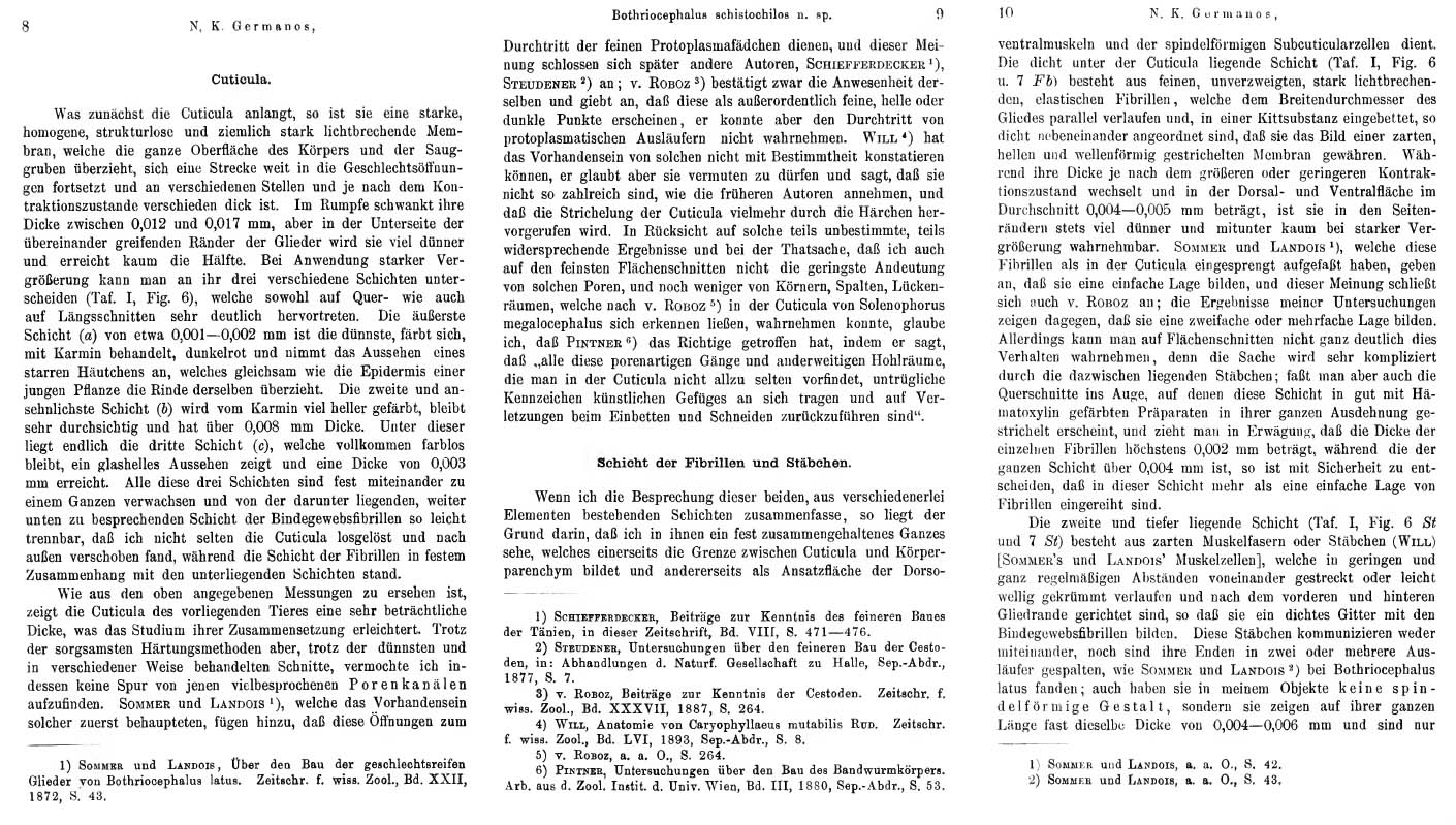 Germanos, N. K. 1895. Bothriocephalus schistochilos n. sp. Ein neuer Cestode aus dem Darm von Phoca barbata. Jenaische Zeitschrift für Naturwissenschaft 30: 1-38. (6873) Download PDFLühe, M. 1899. Zur anatomie und systematik der Bothriocephaliden. Verhandlungen der Deutschen Zoologischen Gessellschaft 9: 30-55. (4540) Download PDF |