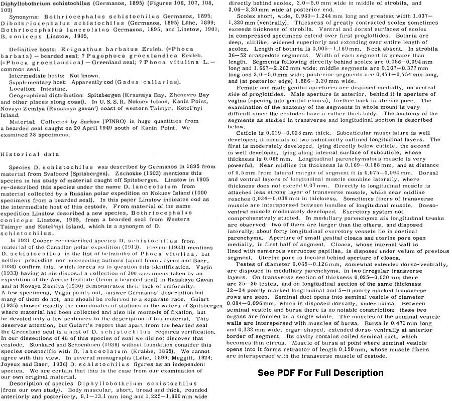 | Valid Name | Diphyllobothrium schistochilos (Germanos, 1895) Cooper, 1921 |