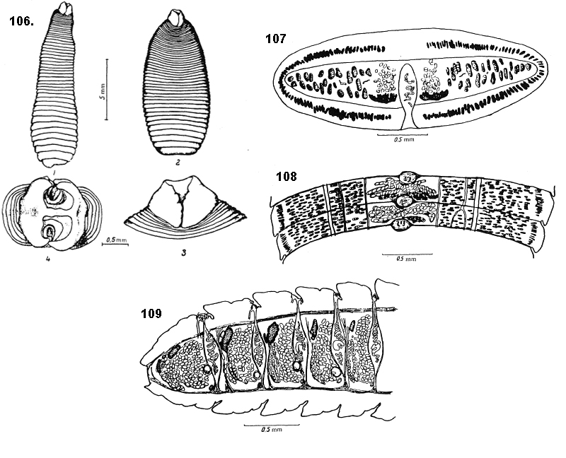 106. Diphyllobothrium schistochilus (germanos, 1895): 1, 2 - general view; 3 - ventral view of scolex; 4 - apical view of same (original). 107. Diphyllobothrium schistochilus (Germanos, 1895). Transverse section of one of the terminal segments (original). 108. Diphyllobothrium schistochilus (Germanos, 1895). Horizontal section of two mature segments (original). 109. Diphyllobothrium schistochilus (Germanos, 1894). Sagittal section through last segments of strobila (median plane, original).
